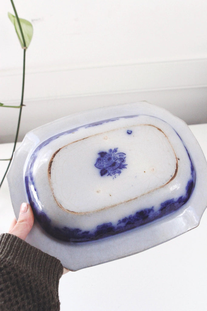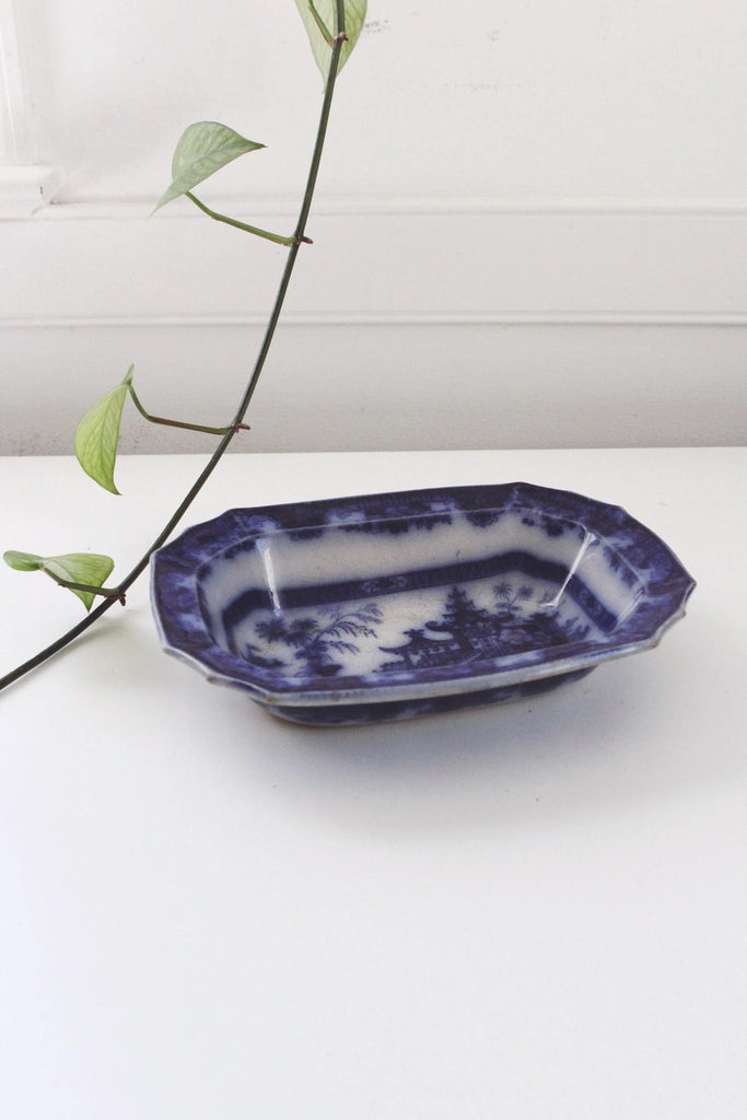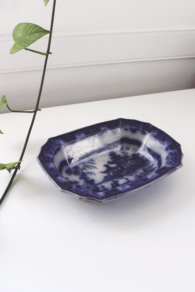 Style: Flow Blue, characterized by a blue design that "flows" into the white body during firing.