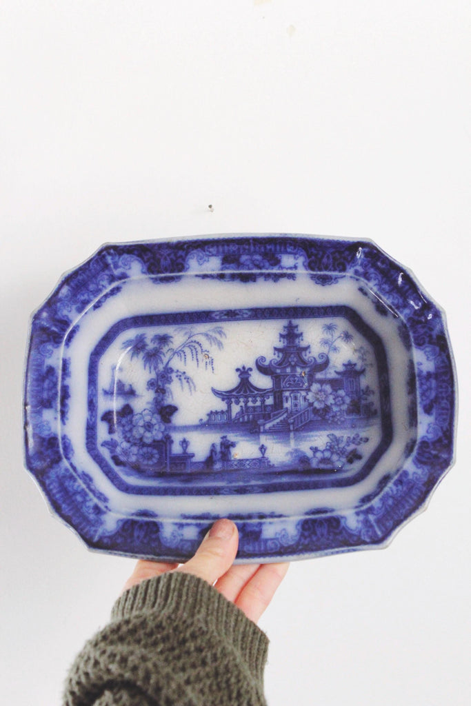 This item is an antique Flow Blue transferware platter, often featuring oriental-style landscapes, produced by various Staffordshire potteries in England during the 19th century.
