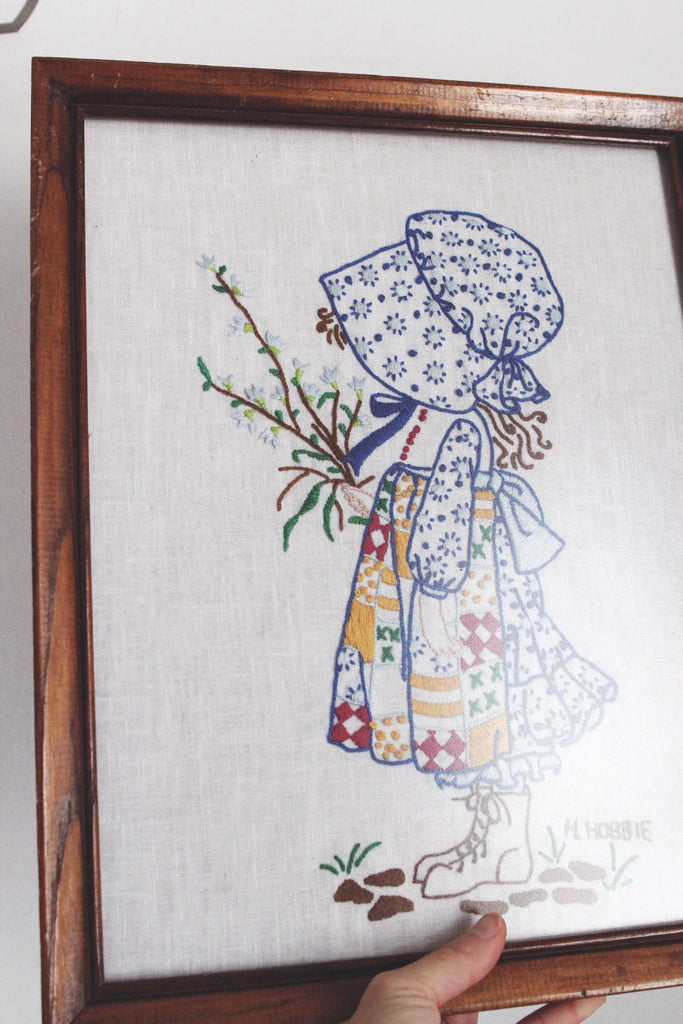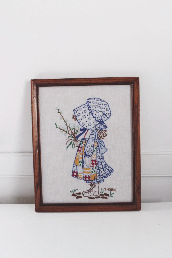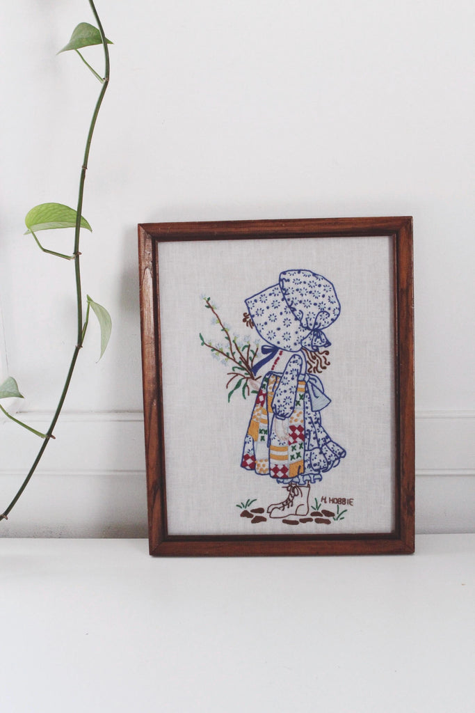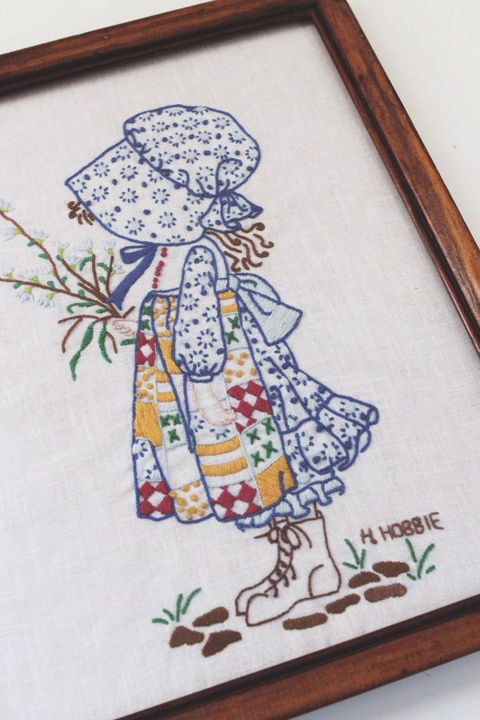 Vintage Holly Hobbie framed needlework piece from the 1970s.