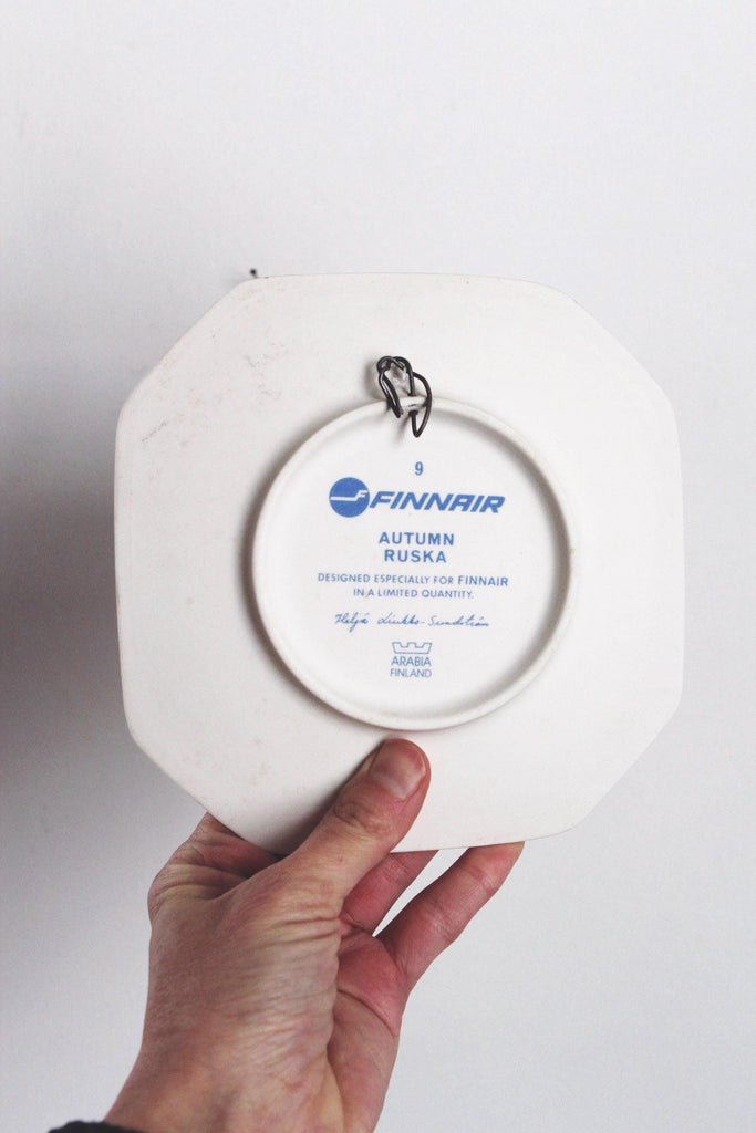 This item is an Arabia Autumn (Ruska) wall plate, specifically designed by artist Heljä Liukko-Sundström for Finnair in a limited production run during the 1990s.