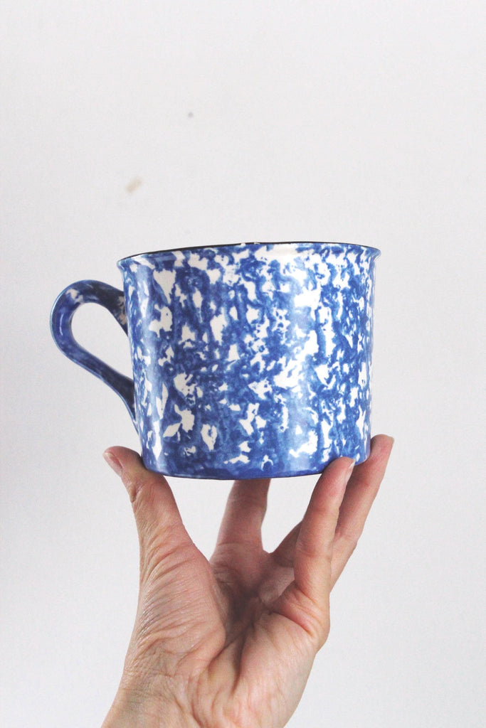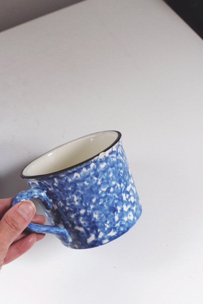 Design: These mugs often feature a classic blue sponged or speckled glaze over a white base, sometimes with a dark trim.