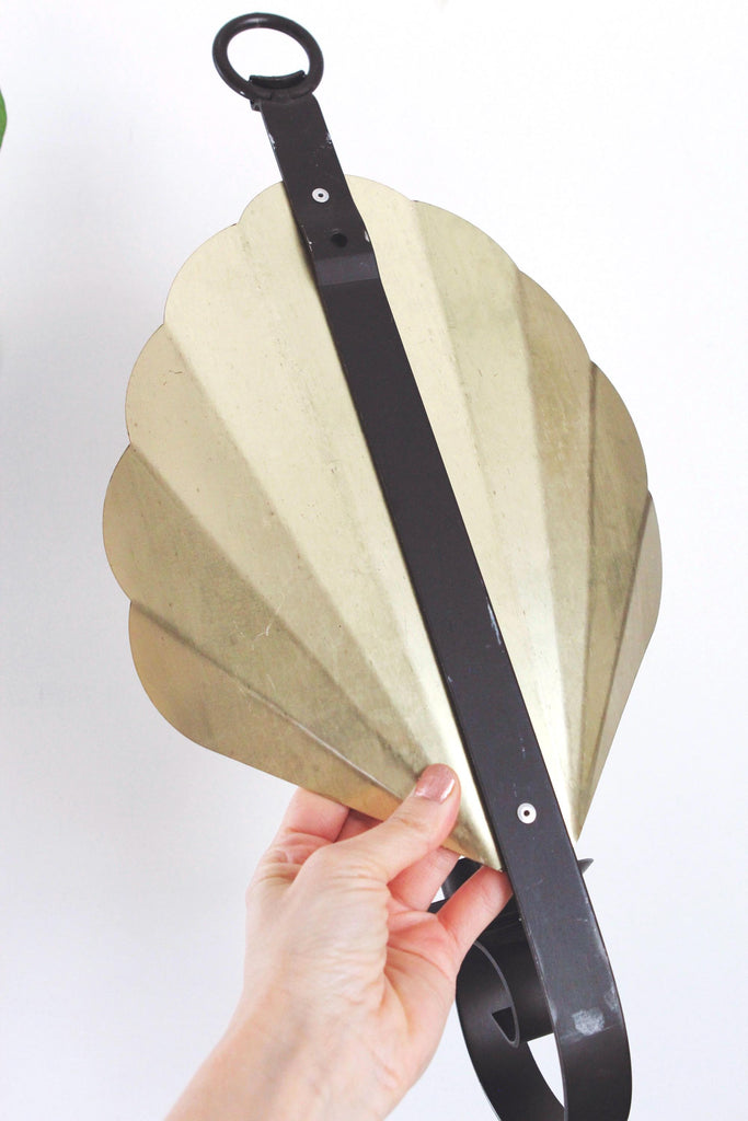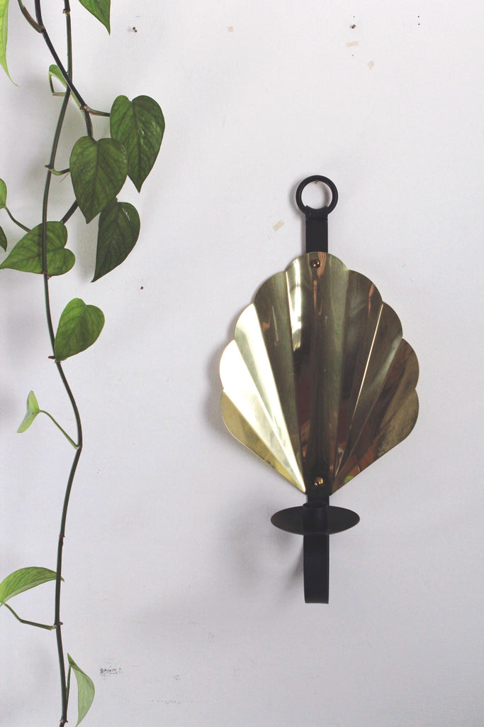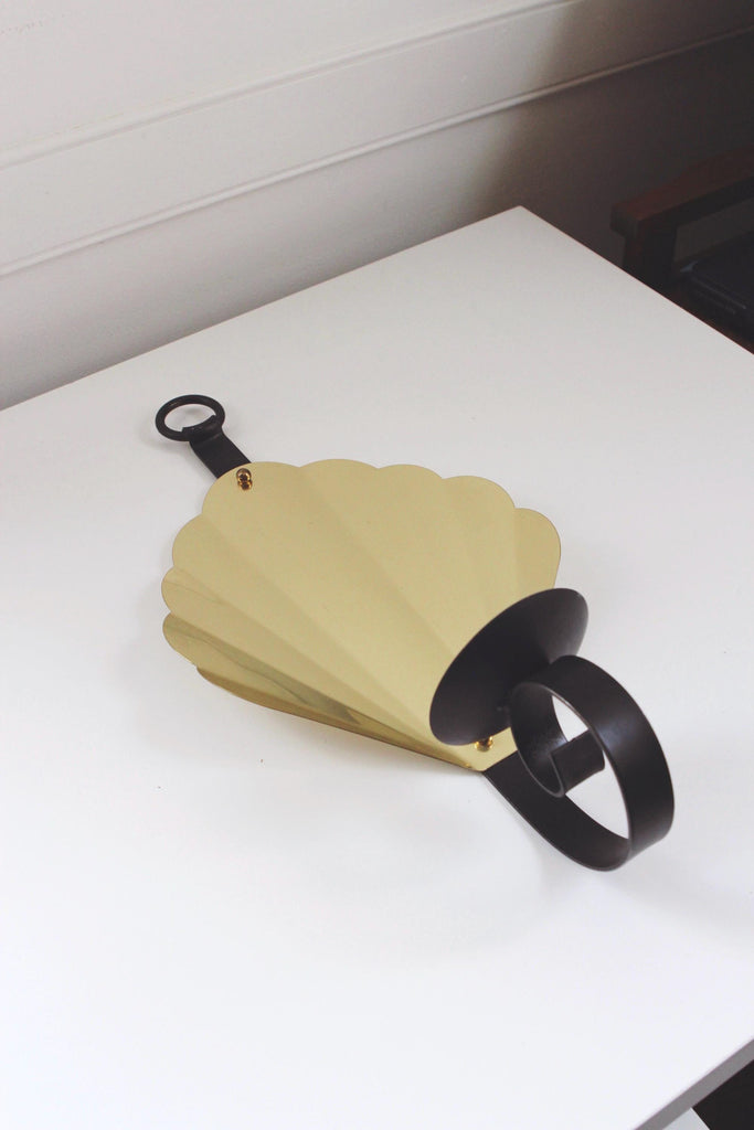 This item is a vintage brass clam shell wall sconce or candlestick holder, featuring a black wrought iron base with a gold-colored shell reflector.