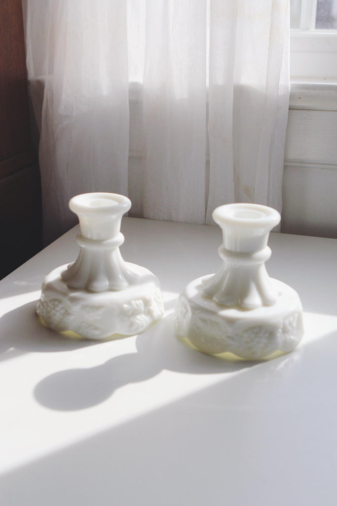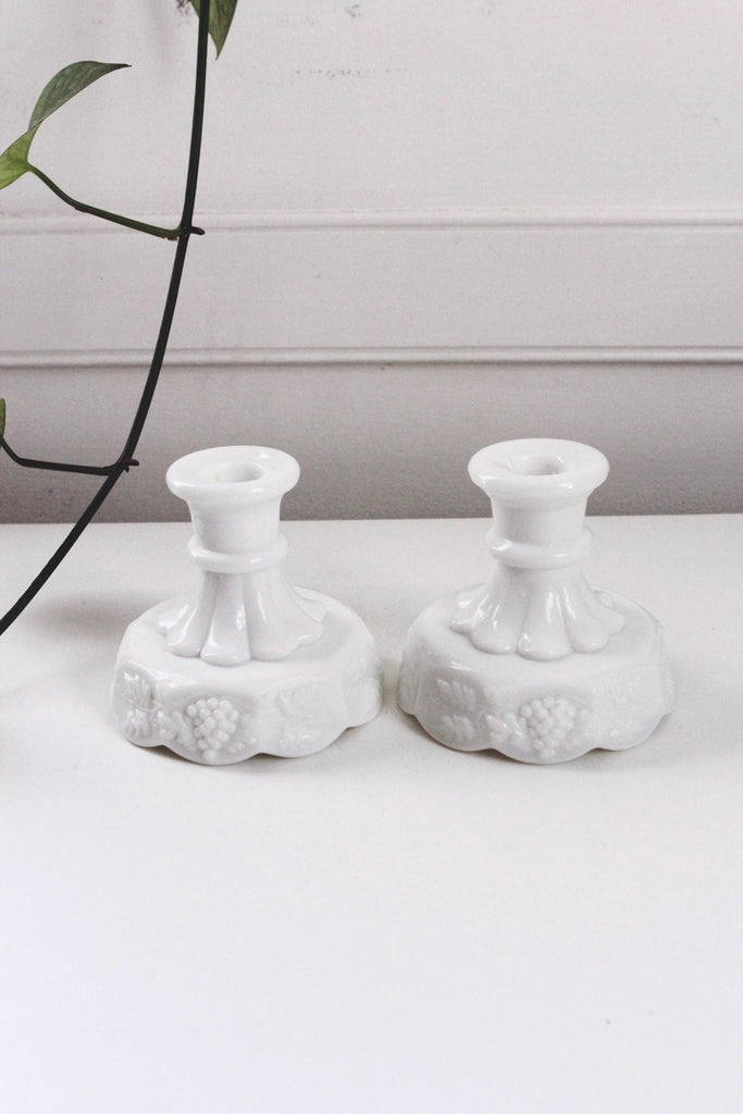 Vintage Milk Glass Candle Candlestick Holders - Westmoreland Paneled Grape Pattern