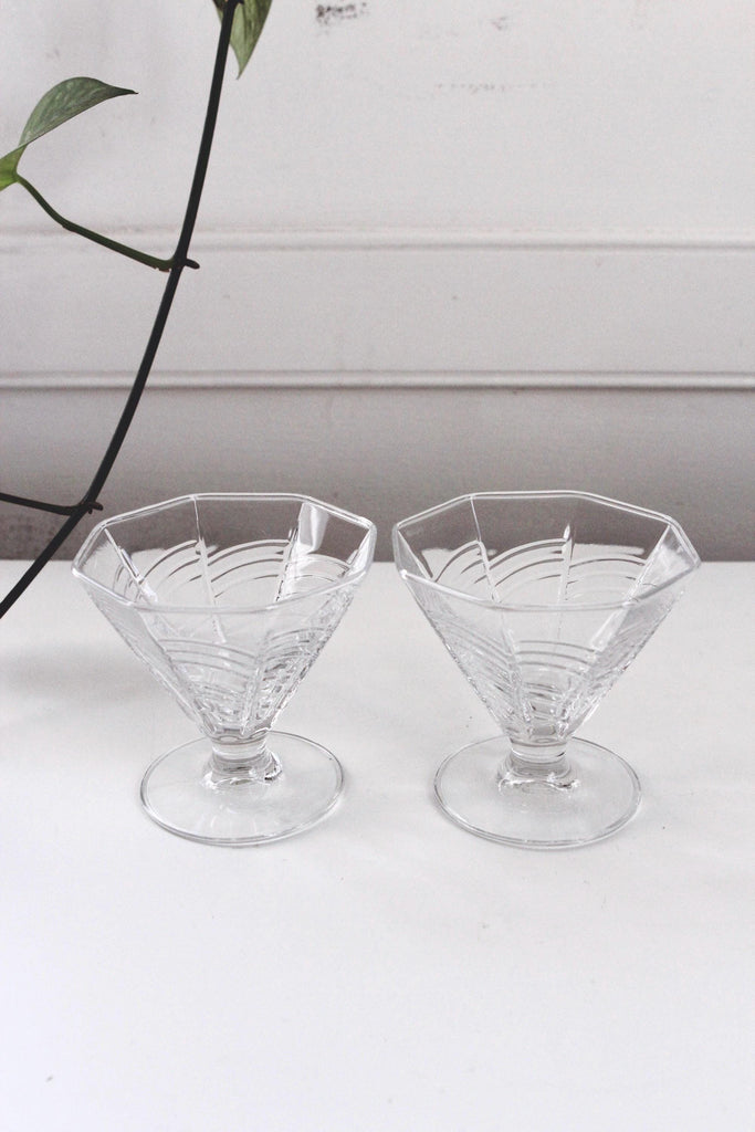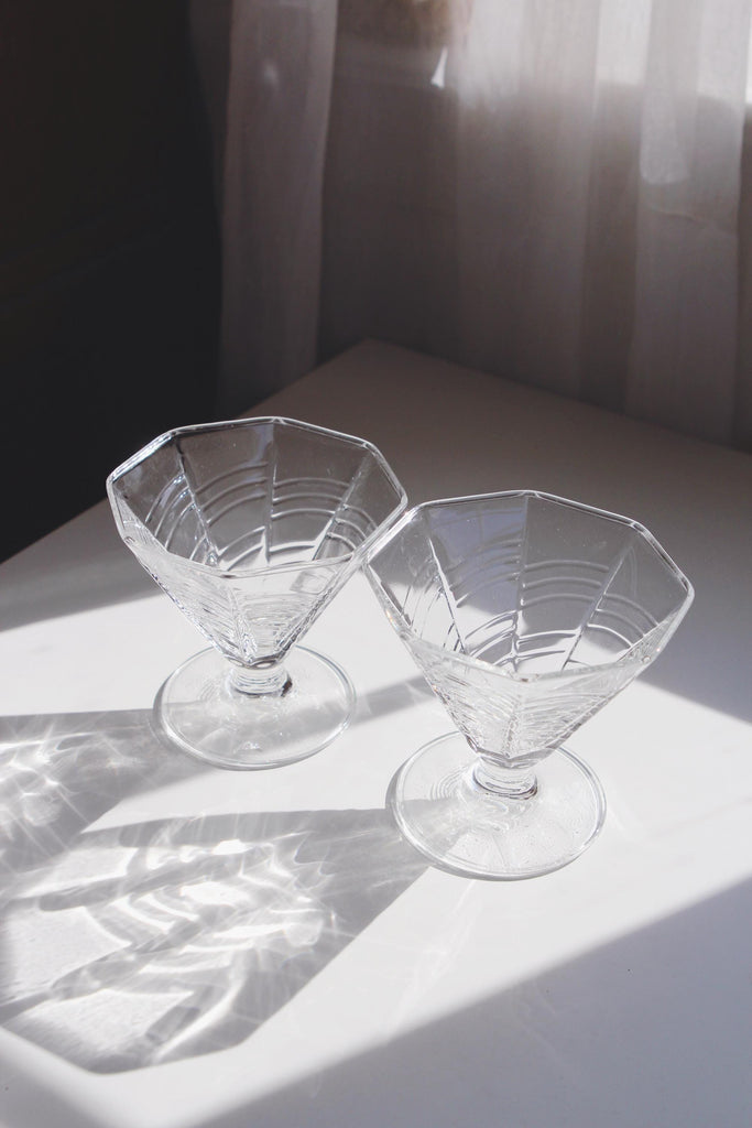 These are vintage Dansk Summerhouse pattern glass dessert stems or champagne coupes, featuring a distinct octagonal shape and a molded web pattern.