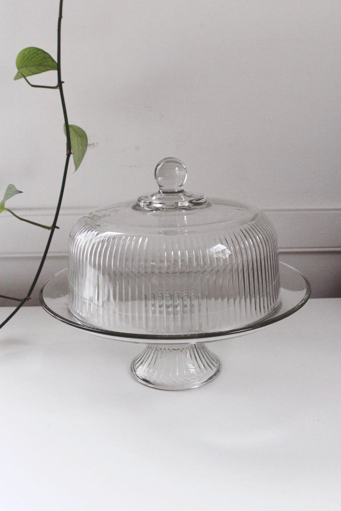 Vintage Glass Pedestal Cake Stand - Ribbed Design, Dome Lid - 12"