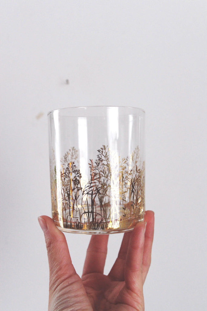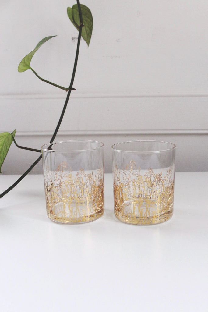 Vintage Gold Decal Trees Branches Rocks Glasses Tumblers Set Pair