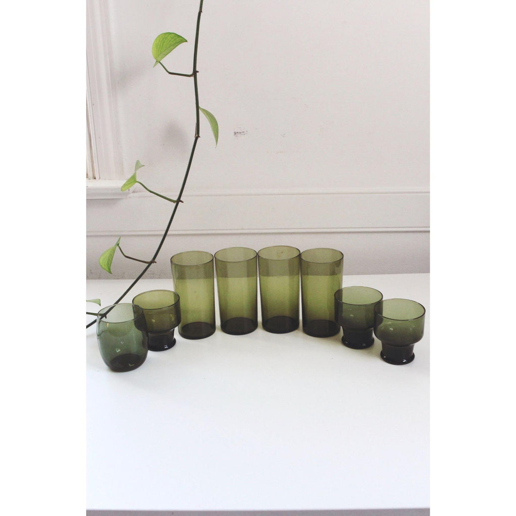 Vintage Green Glasses Set Of 8 - Mid-Century Modern Drinkware - Tall Tumblers, Small Goblets