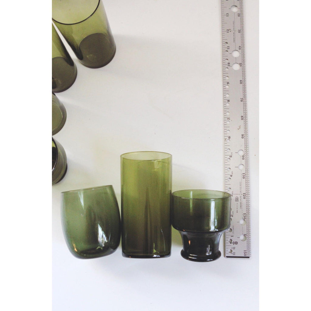 Featuring a blend of tall tumblers and shorter, footed pedestal glasses in an avocado or olive green hue.