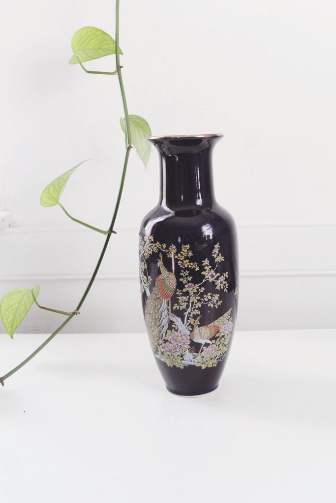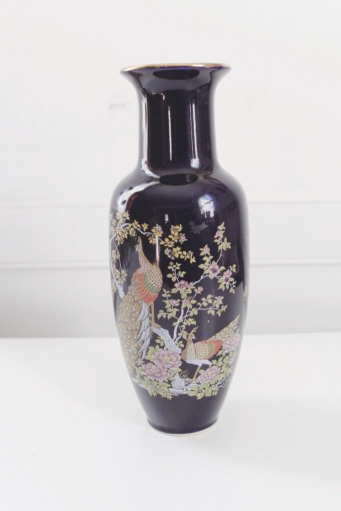This is a vintage Japanese blue ceramic vase featuring a hand-painted peacock and cherry blossom design.
