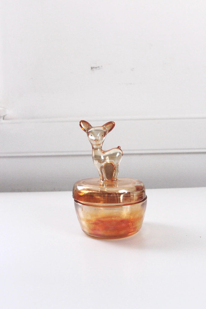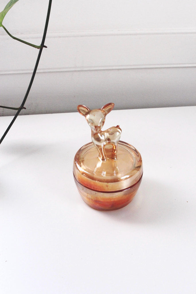 This is a vintage Jeanette Glass marigold carnival glass deer or fawn powder jar/trinket dish.