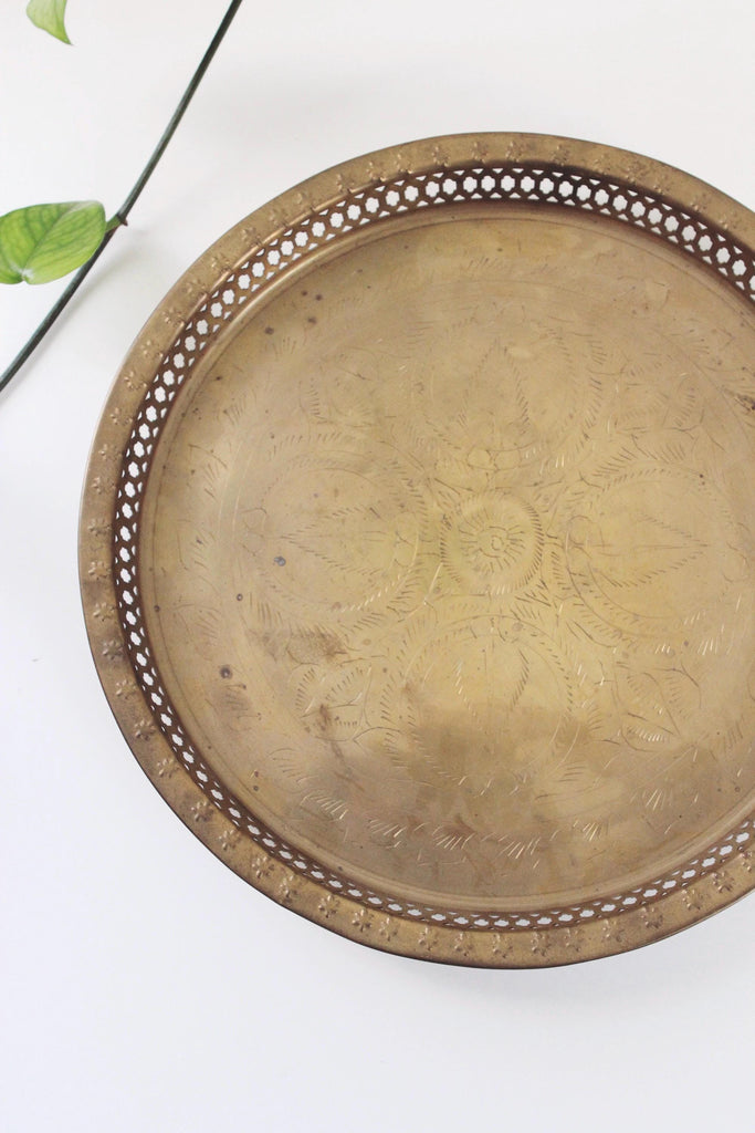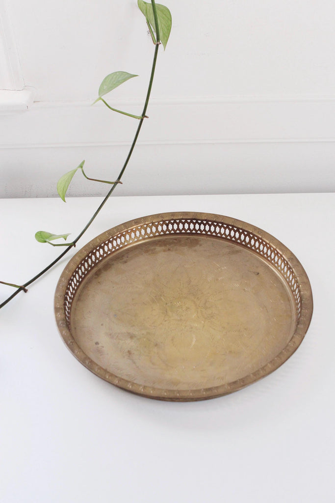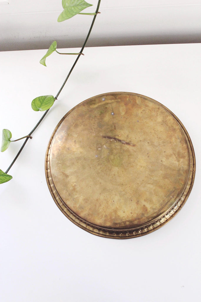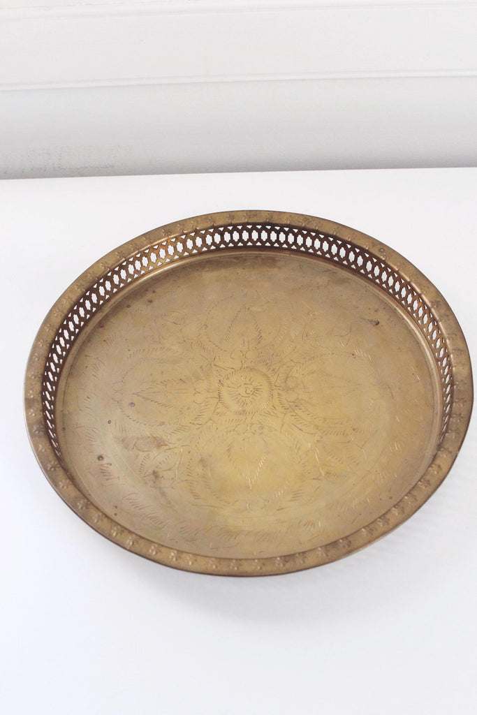 Vintage etched round brass serving tray.