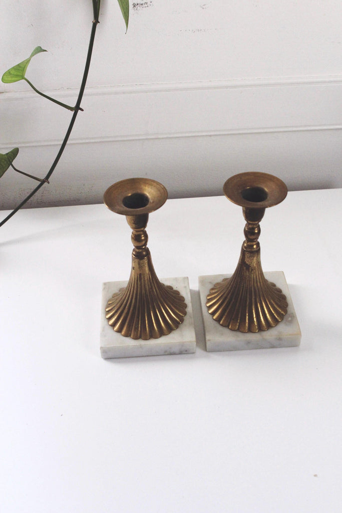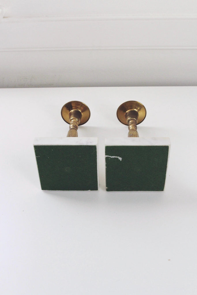 Vintage Mid-Century Modern Brass Carrera Marble Torchiere-Style Candlestick Holders Pair