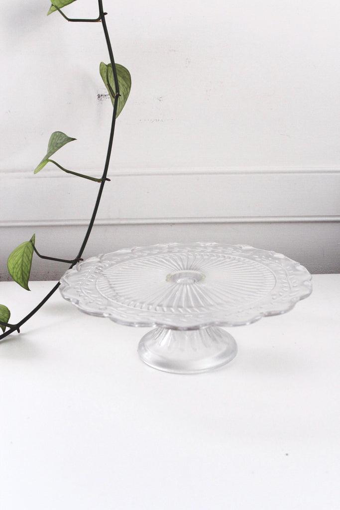 Vintage Pedestal Cake Stand - Vines Pattern, Scallop Edge - Clear Pressed Glass