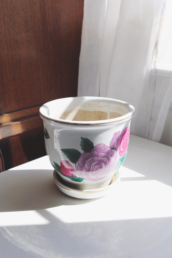 Vintage Planter Pot - Hand Painted Rose Pattern - Ceramic Pottery