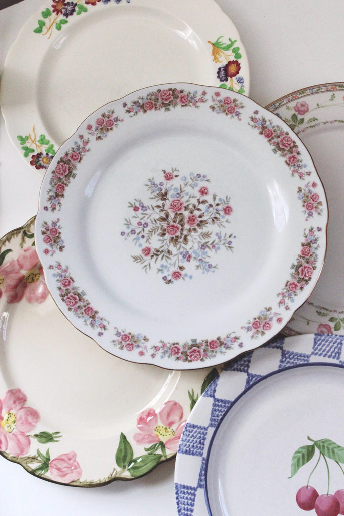 Vintage mismatched china tableware plates and dishes featuring various curated patterns and colorways.