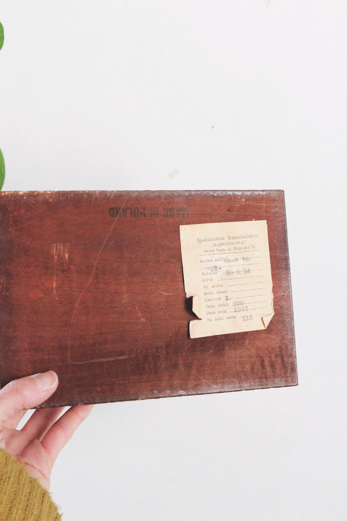 This is a vintage Polish folk art wooden trinket box with a hinged lid and floral design.