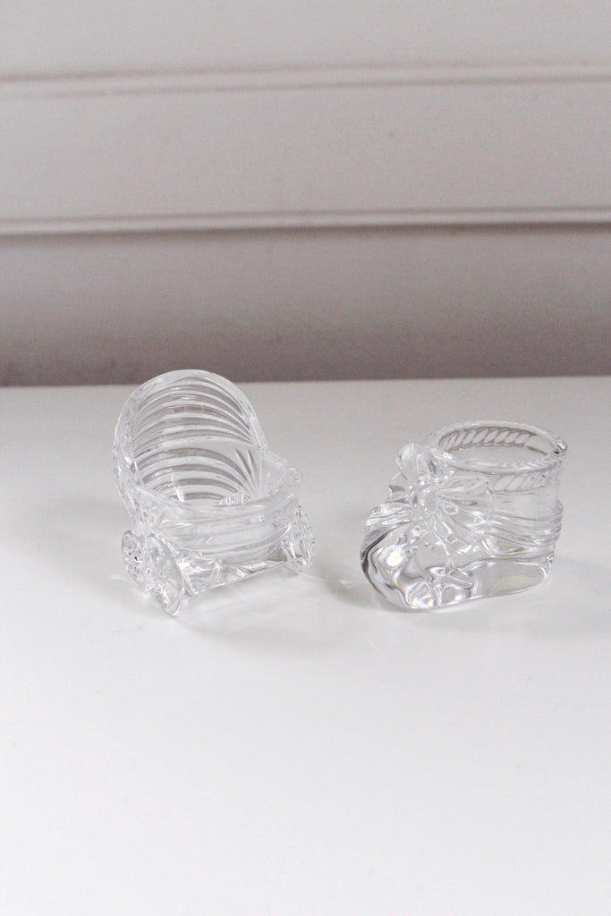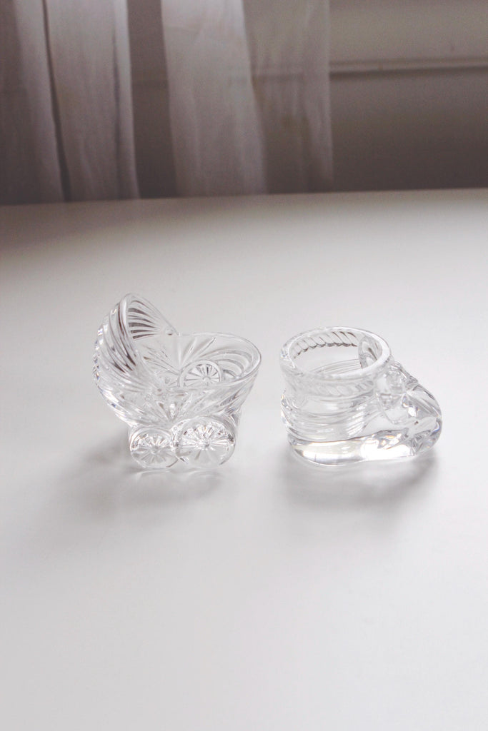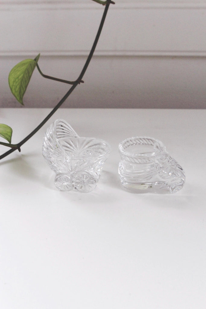 These are vintage crystal collectibles, a baby carriage and a baby bootie, often produced by Princess House in the 1970s and 1990s.