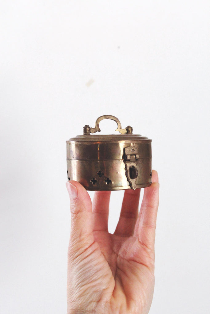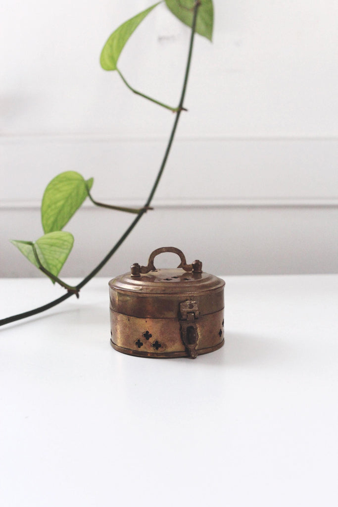 Vintage brass trinket box or incense container with pierced design and hinge and latch.