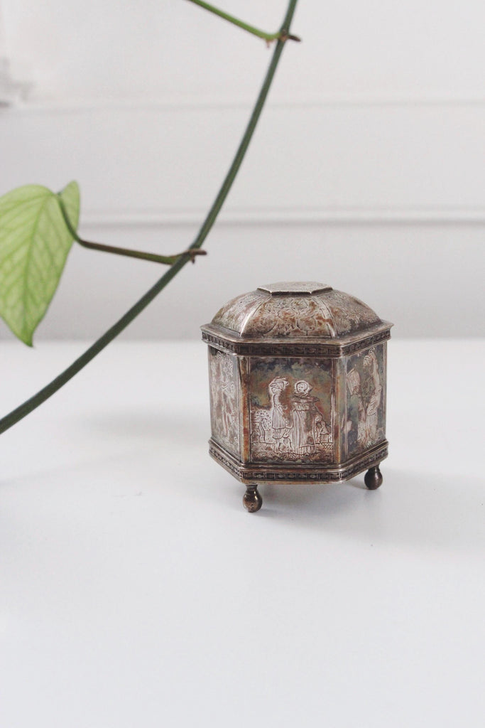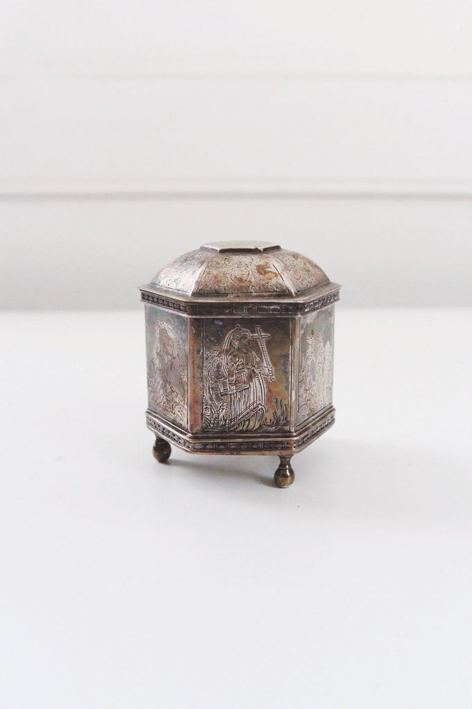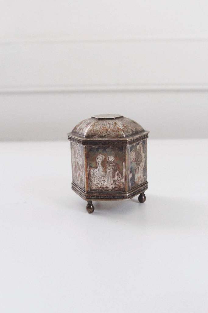 Design: It is a small, hexagonal box featuring ornate engravings of courting couples and saints.