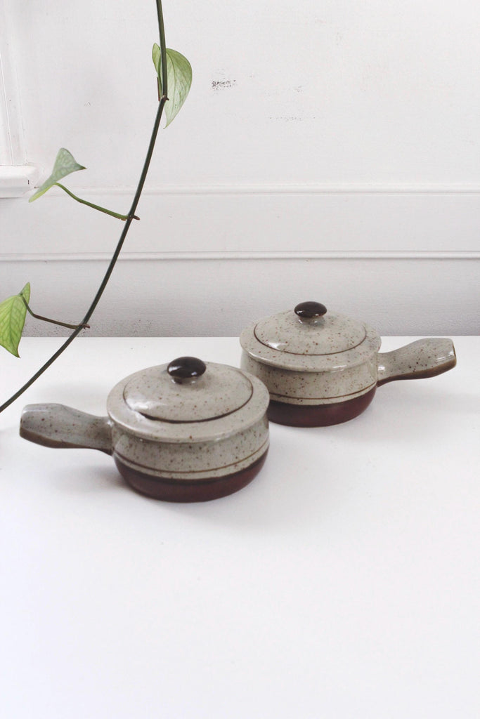Vintage Soup Bowl Crock - Stoneware Pottery, Speckled, Lidded, Handle - French Onion Soup