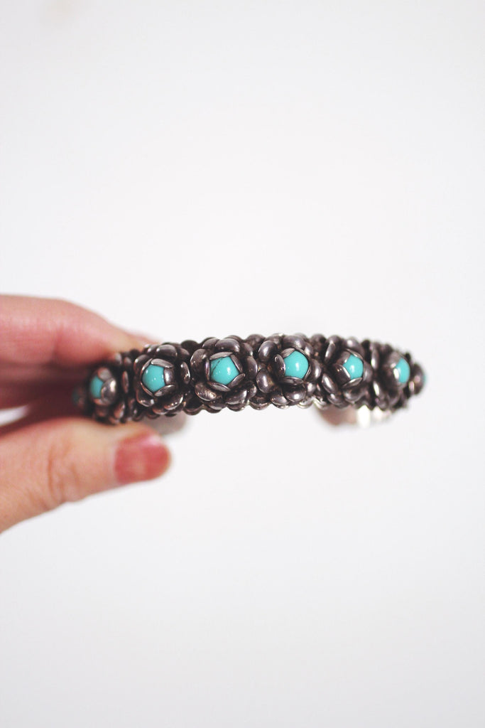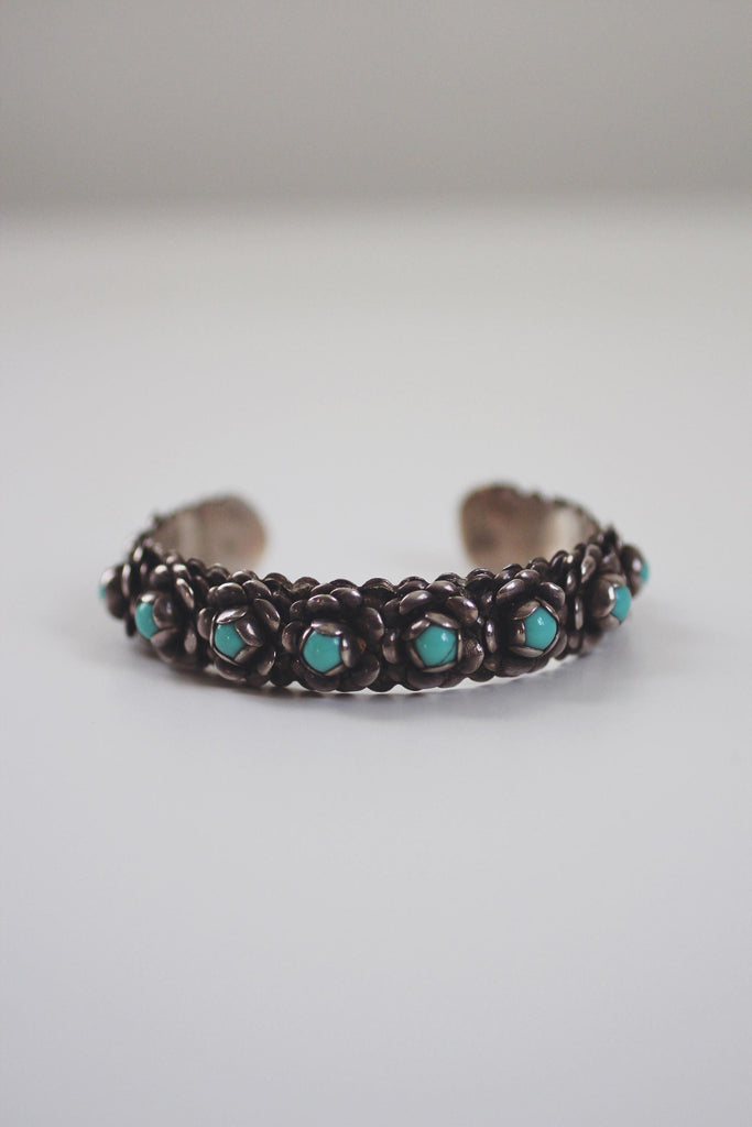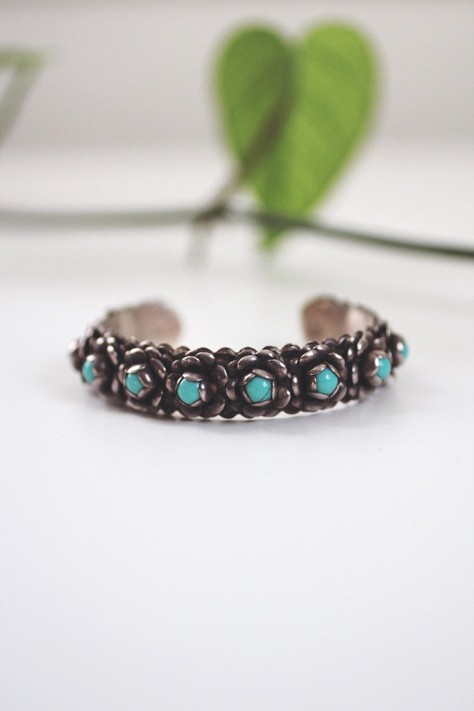 Vintage Sterling Silver Turquoise Flower Cuff Bracelet