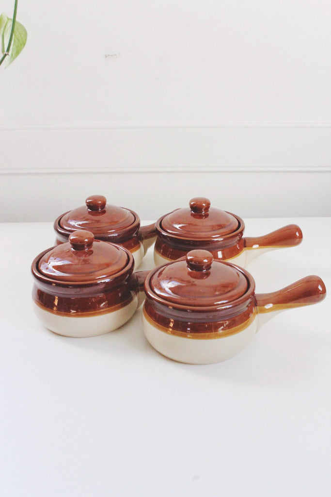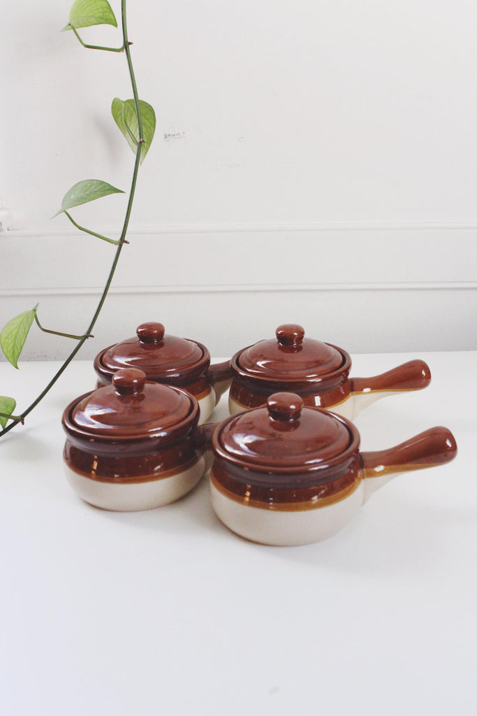 Vintage Stoneware Brown Drip Glaze Lidded French Onion Soup Crock Bowl | Sold Individually