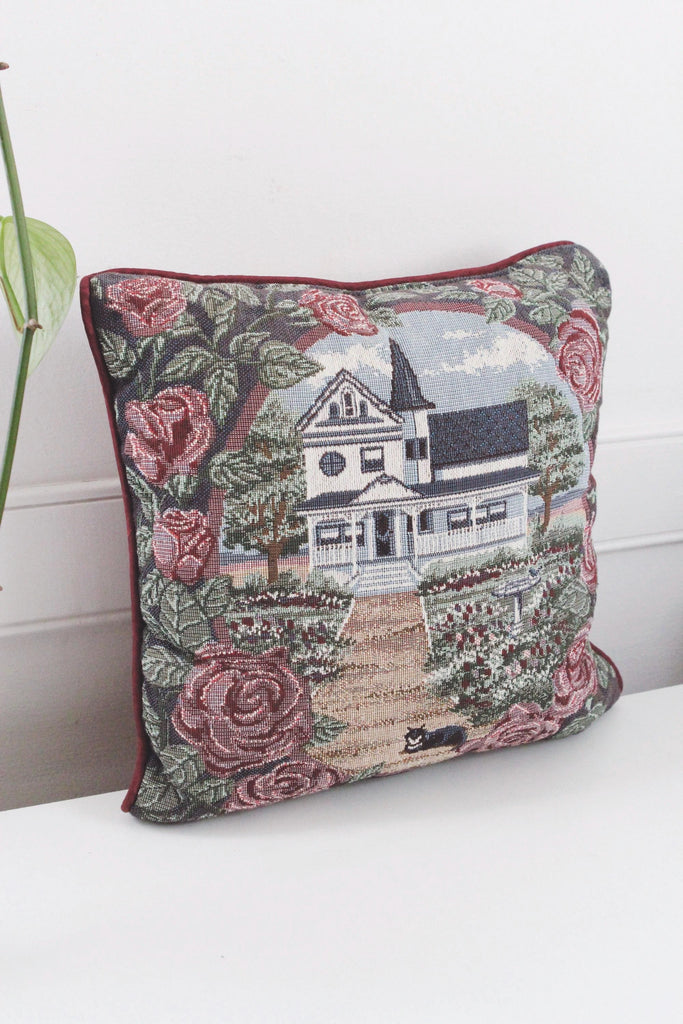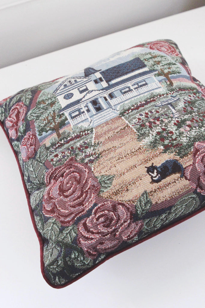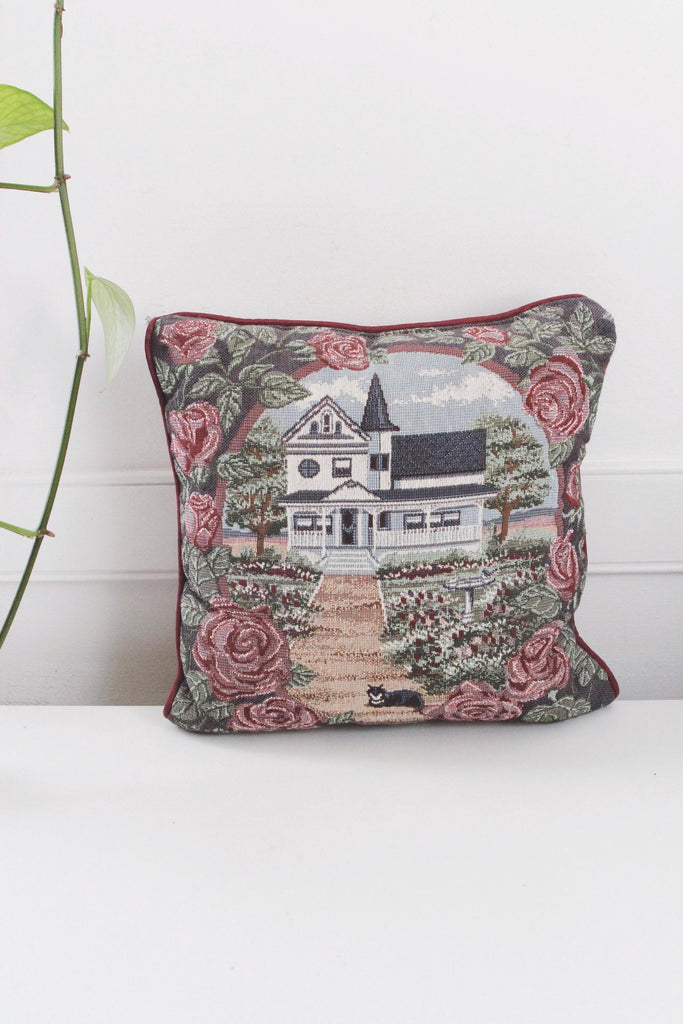This item is a vintage tapestry throw pillow featuring a country house or floral design.