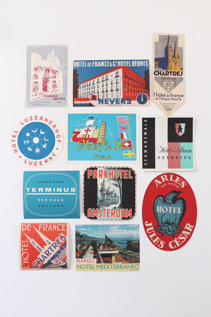 Vintage travel luggage labels featuring various European hotels, locations, etc.