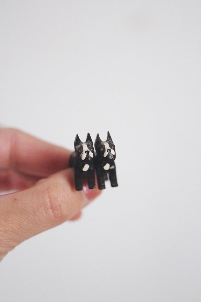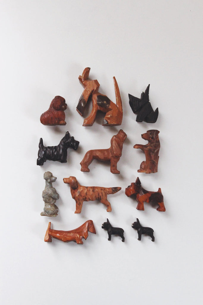 Vintage hand carved wood as miniature dog figurines.