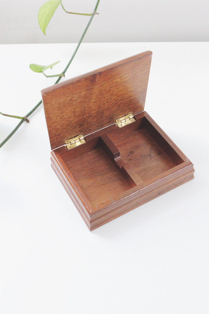 Hinged wooden box designed to hold playing cards.