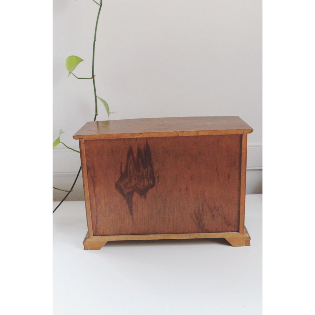 These miniature dresser-style boxes were popular for vanity and dresser-top organization, often featuring a mix of drawers for small trinkets and side compartments for hanging necklaces.