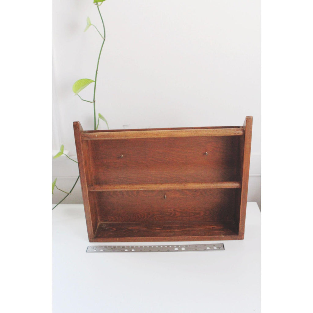 This vintage wooden wall shelf features two rods, adding a rustic charm to any space. Ideal for displaying or organizing items.